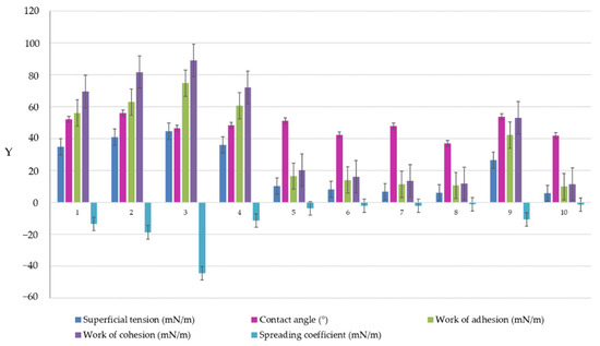 where Wa represents the work of adhesion calculated using the Dupré equation; Wc—the work of cohesion; S—the work of spreading or spreading coefficient, which derives from Harkins’ theory of spreading; γLG—the superficial tension to L/G interface; and θ—the contact angle determined previously by applying the contact angle model.