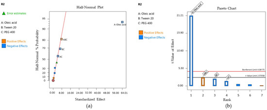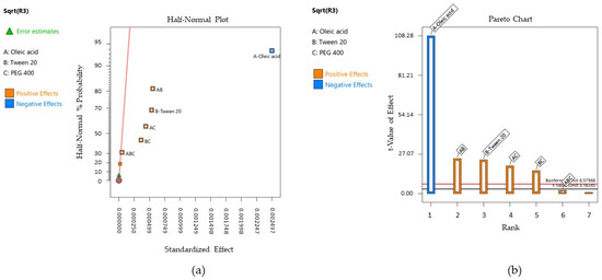 The screening design was concentrated on the generation of two levels, three factors full factorial plan. The three variables selected in this design are presented in Table 4. The levels of variation were coded as low (−1) and high (+1). For the model’s reliability, the factorial plan was augmented with two more experiments, and here, two lack of fit points were generated by the software, resulting in a 23 + 2 model.