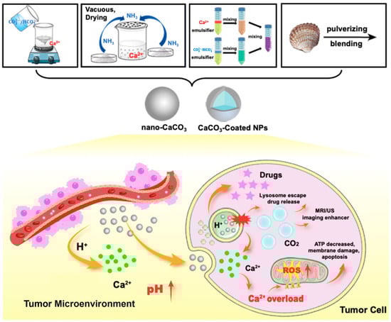 CaCO3 nanoparticles have significant advantages such as pH sensitivity and a high Ca2+ content. When the nanomaterials containing CaCO3 enter the low-pH environment of the tumor tissue, CaCO3 decomposes, neutralizes acidic H+, generates large amounts of Ca2+, and generates CO2. When these substances enter tumor cells, they can specifically regulate the metabolic process of tumor cells by their special properties. Below, we will discuss some of the effects and mechanisms of CaCO3 nanoparticles in cancer diagnosis and treatment from different aspects.