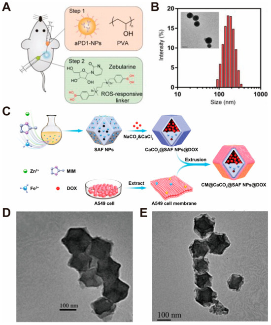 Example diagrams associated with the chemical precipitation method for the preparation of CaCO3 nanoparticles. (A) Schematic illustration of ROS/H+ dual-bioresponsive drug delivery depot. (B) Particle size distribution of aPD1-loaded CaCO3 NPs measured by dynamic light scattering (DLS) and morphology observed by transmission electron microscopy (TEM), where the scale bar is 100 nm. Adopted with permission from Ref. [34]. 2023, Chenteng Lin. (C) The above figure reveals the preparation of CM@CaCO3@SAF NPs@DOX nanoplatforms. (D) The TEM image of SAF NPs. (E) The TEM image of CaCO3@SAF NPs@DOX. Scale bars: 100 nm. Adopted with permission from Ref. [35]. 2023, Chenteng Lin.