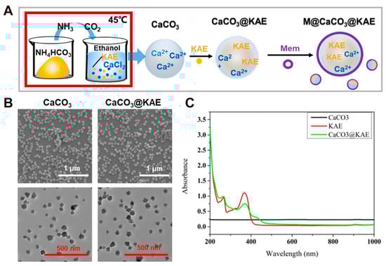 Schematic illustration and characterizations of KAE-loaded M@CaCO3@KAE NPs. (A) Schematic illustration of the synthesis process of M@CaCO3@KAE NPs. (B) TEM images of the CaCO3 NPs and CaCO3@KAE NPs. (C) UV–vis absorbance spectra of CaCO3 NPs, KAE, and CaCO3@KAE NPs. Adopted with permission from Ref. [61]. 2023, Chenteng Lin.