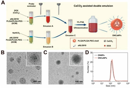 Liu and Feng et al. [83] adopted an improved W1/O/W2 double emulsification method to prepare CaCO3 nanoparticles (Figure 4A). Briefly, to prepare emulsions A (CaCl2 phase) and B (NaHCO3 phase), first, a CaCl2 aqueous solution (containing DOX) and a NaHCO3 aqueous solution were added to the dichloromethane solution containing alkylated NLG919 (Anlg919), poly(lactic-co-glycolic acid) (PLGA), and poly(lactic-co-glycolic acid)-polyethylene glycol (PLGA-PEG) followed by 99 pulses using the probe sonicator for sonication. Then, emulsions A and B were mixed and 99 pulses were performed using the probe sonicator to obtain emulsion C. Emulsion C was added dropwise to the polyvinyl alcohol (PVA) solution under sonication in a water bath and left overnight to remove the dichloromethane by evaporation. Afterward, the obtained DNCaNPs were washed by centrifugation to remove excess PVA, free drug, and large particles. With the help of TEM, it was observed that there were obvious dark spots of CaCO3 nanoparticles in the DNCaNPs, and the content of CaCO3 was 17.6% as measured by a commercial calcium colorimetric assay kit (Figure 4B–D).