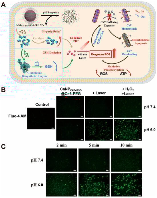 Example of nanosystems constructed from CaCO3 nanoparticles for calcium overload of tumor cells. (A) Schematic illustration of the CaNPCAT-BSO@Ce6-PEG NPs for PDT-enhancing and mitochondrial Ca2+ overload synergistic therapy. (B) The CLSM images demonstrate the difference in intracellular Ca2+ content after different groups of drug treatments. (C) The CLSM images demonstrate the detection of intracellular Ca2+ content after irradiation for different times. Adopted with permission from Ref. [97]. 2023, Chenteng Lin.