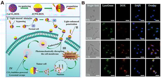 In the low-pH environment, CaCO3 decomposition is not only able to produce Ca2+ but also to generate CO2 gas for gas-driven reactions in tumor cells. When the nano-drug delivery system based on CaCO3 enters the lysosome, CaCO3 decomposes into large volumes of CO2 in the low-pH environment, which drives the platforms to penetrate the lysosome barrier and release the drugs. Moreover, because of the driving effect of gas, the drug release can be accelerated [102]. Jiao and Zhang et al. [102] designed a cascaded Near-Infrared (NIR) light/gas-driven Janus CaCO3 particle micromotor (JCPM) to overcome the biological barrier at various stages after the system enters the body to achieve active drug delivery targeting tumor cells (Figure 6A). When the JCPM enters the lysosome, large amounts of CO2 are rapidly produced during CaCO3 decomposition in an acidic lysosomal microenvironment, and the pressure in the lysosome increases dramatically, promoting gas-driven lysosomal escape and DOX release induced by CaCO3 decomposition (Figure 6B).