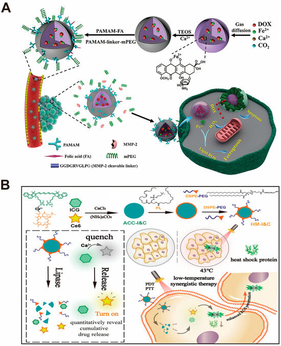 In addition to surface mineralization of mesoporous nanoparticles, CaCO3 is also capable of achieving good surface wrapping for novel metal–organic framework (MOF) materials. Li and Tang et al. [55] reported that an Fe-based NMOF (nanoscale MOF) is used for the synergistic tumor treatment (Figure 10D). When the nanoplatforms reach the target site, the CaCO3-mineralized layer can begin to dissolve, resulting in the generation of NMOF@DHA and Ca2+. Subsequently, Ca2+ acts synergistically with Fe3+ in the NMOF@DHA structure, DHA, and the photosensitizer TCPP through Fe2+-DHA-mediated chemodynamic therapy, Ca2+-DHA-mediated tumor therapy (OT), and TCPP-mediated PDT showing a triple synergistic therapeutic effect and exhibiting high therapeutic efficiency, capable of achieving complete tumor ablation.