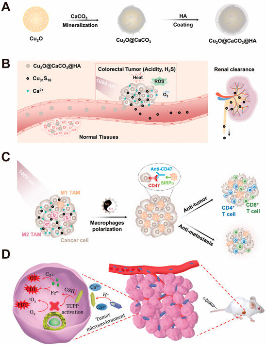- Chang, M.; Hou, Z.; Jin, D.; Zhou, J.; Wang, M.; Wang, M.; Shu, M.; Ding, B.; Li, C.; Lin, J. Colorectal Tumor Microenvironment-Activated Bio-Decomposable and Metabolizable Cu2O@CaCO3 Nanocomposites for Synergistic Oncotherapy. Adv. Mater. 2020, 32, e2004647. [Google Scholar] [CrossRef] [PubMed]