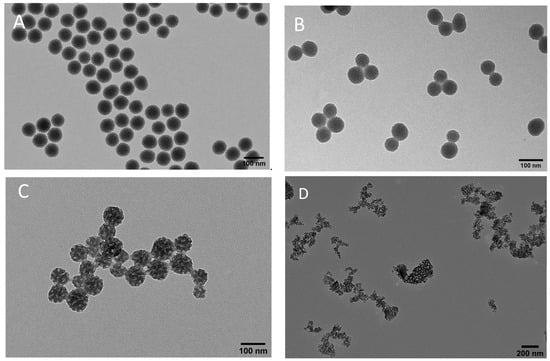 A key modification involved grafting PEI onto the MSNs, thereby facilitating the subsequent PDA coating by introducing amine groups to the surface. The hydrodynamic diameters (Z-average) for MSNs, PEI-MSNs, and PDA–PEI–MSNs were determined to be 96.7 ± 1.21 nm, 118.8 ± 1.70 nm, and 147.5 ± 1.1 nm, respectively. The notably increased size of PDA–PEI–MSNs further corroborated the formation of a polymerized layer of dopamine on the PEI-MSN surface. ζ-potential analysis revealed a shift in the MSN net surface charge from −27.8 ± 1.0 mV to +32.9 ± 1.3 mV under identical HEPES buffer conditions (25 mM, pH 7.2) after the grafting of PEI. This change can be attributed to the introduction of a high abundance of amine groups on the MSN surface. Following PDA coating of PEI-MSNs, the ζ-potential shifted to negative again (−31.3 ± 1.8 mV) due to the presence of hydroxyl groups of the formed polydopamine layer (Table 1). Microscopic observation by TEM showed spherical nanoparticles with dendritic pore structure for MSNs, PEI-MSNs, and PDA–PEI–MSNs, with sizes centered at 73.6 ± 1.9 nm, 62.8 ± 1.4 nm, and 93.95 ± 4.49 nm, respectively (Figure 1A,B), based on image analysis (Image J).