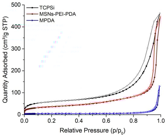 Nitrogen adsorption–desorption isotherms of TCPSi, PDA–PEI–MSNs, and MPDA nanoparticles.