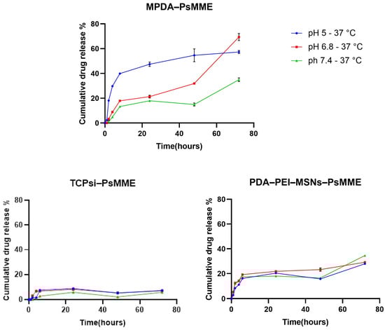 Nanoparticles can be used to extend the duration of drug release, which gives them certain advantages over immediate-release formulations, such as the potential for reducing dosing frequency and maintaining consistent drug concentration over time [,]. In this study, the PsMME release from the three nanoparticle formulations PDA–PEI–MSNs, TCPSi, and MPDA was carried out in acetate buffer, phosphate buffer, and PBS at the three different pH conditions of 5.5, 6.8, and 7.4, respectively, at 37 °C for 72 h (Figure 4), corresponding to endosomal, intratumoral/inflamed tissue, and extracellular conditions. According to statistical analysis, there are significant differences in drug release between the three different pH conditions (pH 5.5, 6.8, and 7.4) for each of the three nanoparticles (**** p < 0.0001). This may be owing to polydopamine (in PDA–PEI–MSNs and MPDA) being sensitive to low pH, i.e., being more soluble under acidic conditions, due to the protonation of its functional groups []. Therefore, a higher percentage of PsMME accumulative release can be observed at lower pH [,]. Since the other components (MSN, TCPSi) are not pH-responsive, the slight differences in release behavior under different pH conditions can most likely be attributed to the pH-dependent solubility of the drug molecule itself. Overall, the drug release profiles of the three nanoformulations show a sustainable release pattern over 72 h, which is an indication of incorporation of PsMME in the pores of the nanoparticles. MPDA showed the highest drug release fraction of 69.33 ± 1.62% after 72 h at pH 6.8 compared to the other nanoparticles and release conditions.