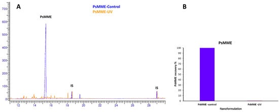 (A) The superimposition of GC–FID chromatograms of PsMME–control (before UV exposure) and PsMME–UV (after UV exposure); IS—internal standard. (B) The recovery percentage of PsMME after exposure to UV light.