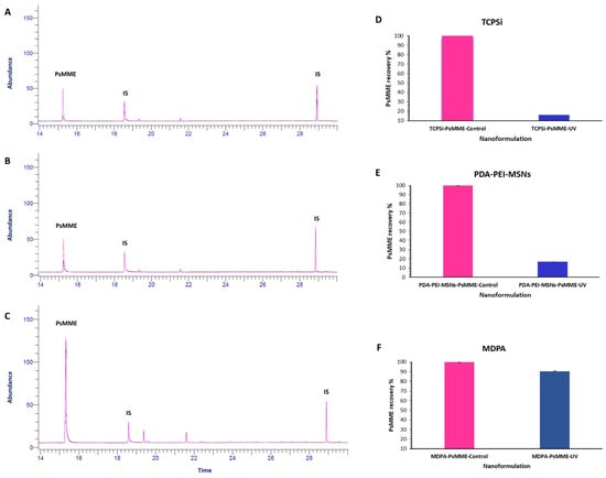 To determine and compare the effect of our dark nanoparticles on PsMME photostability, GC-FID analysis was conducted on the three nanoformulations of PDA–PEI–MSN–PsMME, TCPsi–PsMME, and MPDA–PsMME before (controls) and after they were exposed to the UV light. The aim was to measure the relative residual PsMME content (recovery%) within the nanoparticles after the UV treatment. Simultaneously, the corresponding three control nanoformulations were maintained in a stirred state to observe any potential influence of the preparation process on the results. Afterward, the specific impact of UV exposure on the PsMME content in these formulations was calculated. The impact of the UV light exposure on PsMME was assessed through GC–FID, revealing a significant degradation of more than 90% without any nanoparticles (Figure 5). PDA–PEI–MSN and TCPSi formulations exhibited protection against the UV-light induced degradation, with 16.75% (Figure 6B,E) and 15.88% (Figure 6A,D) recoveries, respectively, following a 30-min UV light exposure. Intriguingly, MDPA demonstrated remarkable protective properties, preserving 90.5% of the loaded PsMME under the same conditions (Figure 6C,F). The percentage of recovery was calculated using Equation (4).