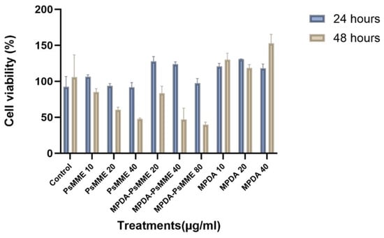 Recognizing the most promising photoprotective characteristics of MPDA nanoparticles for PsMME among the ones studied, as evidenced by their superior 90.5% protective effect against UV light, we further investigated the cytocompatibility of this specific nanoformulation, paving the way for future pharmaceutical studies. To evaluate the cytocompatibility of the MPDA–PsMME nanoformulation, we conducted a cell viability assessment by examining its influence on cell proliferation using the Alamar Blue assay. The HEK-293 cells were selected as a model cell line due to their extensive utilization in pharmaceutical research for cytocompatibility assessment. This choice is rooted in their specific attributes, including a high proliferation rate and their ability to adapt to various culture media []. The HEK293 cells were exposed to distinct concentrations of PsMME (10, 20, 40 μg/mL) alongside corresponding concentrations of MPDA (5, 10, 20 μg/mL) and MPDA–PsMME (20, 40, 80 μg/mL) individually (n = 3) for both 24 and 48 h, as illustrated in Figure 7. Statistical analysis was carried out for the treated HEK293 cells utilizing a two-way ANOVA, revealing a significant variance in cell viability between the two time points (p < 0.0001). Tukey’s multiple comparisons test indicated that there were no notable differences in viability between HEK293 cell samples treated with MPDA–PsMME 20 μg/mL (** p = 0.0037), MPDA–PsMME 40 μg/mL (* p = 0.0138), MPDA 10 μg/mL (* p = 0.0389), and MPDA 20 μg/mL (** p = 0.0012) in comparison with the control sample after 24 h. However, after 48 h, there were significant differences in cell viability for PsMME 20 μg/mL, PsMME 40 μg/mL, MPDA–PsMME 40 μg/mL, MPDA–PsMME 80 μg/mL, and MPDA 40 μg/mL compared to the control sample (**** p < 0.0001). These findings suggest that MPDA itself might exhibit a stimulatory effect on the proliferation of HEK293 cells at lower concentrations. Therefore, it can be inferred that MPDA nanocarriers are safe for in vitro applications at concentrations up to 40 μg/mL. However, elevating the PsMME concentration beyond 10 μg/mL seems to lead to decreased cell proliferation after 24 h of treatment, suggesting a toxic effect of PsMME when exposed to cells at doses exceeding 10 μg/mL for durations longer than 24 h.