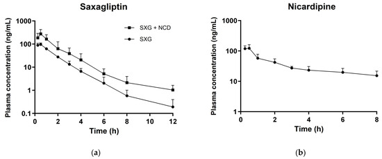 Plasma concentration of saxagliptin in rats after oral administration of saxagliptin alone (5 mg/kg) and co-administration of saxagliptin (5 mg/kg) with nicardipine (15 mg/kg) (a); Plasma concentration of nicardipine in rats after oral administration (15 mg/kg) (b). Circle symbols represent single administrations, while square symbols denote combination administrations. SXG, saxagliptin; NCD, Nicardipine.