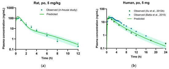 Figure 6a presents the comparison between predicted plasma concentrations obtained from the rat DDI PBPK model and experimental values. Concurrently, Table 8 outlines the corresponding Cmax, AUCinf values extracted from these plasma concentrations, and the resultant DDI ratio. The rat PBPK model effectively anticipated the increase in saxagliptin plasma levels at an oral dose of 5 mg/kg when co-administered with nicardipine at 15 mg/kg. In the co-administration study in rats, the Cmax and AUC for saxagliptin increased by factors of 2.85 and 2.60, respectively, whereas the PBPK model predicted increments of 2.69 and 2.54, aligning closely with the experimental findings.