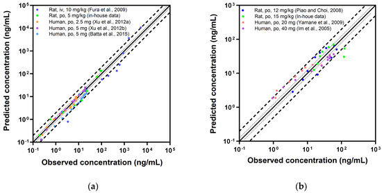 The PBPK model underwent evaluation through a visual comparison between predicted plasma concentration profiles and observed data. The visual assessment involved juxtaposing the predicted concentration with a 95% prediction interval against empirical data sourced from the literature or in-house experiments. Additionally, goodness-of-fit (GOF) plots were employed to compare predicted and observed values for plasma concentrations, Cmax, and AUCinf. Predictions were deemed successful if they did not deviate more than 2-fold from observed values.