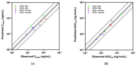 The goodness-of-fit plots, comparing observed plasma concentrations and PBPK model-predicted values for saxagliptin [19,39,40,41] (a) and nicardipine [18,42,43] (b), alongside the comparison of Cmax (c) and AUCinf (d) for both drugs. The solid line denotes the line of identity, while the dotted lines represent 1.25-fold deviation and the dashed lines represent 2-fold deviation.