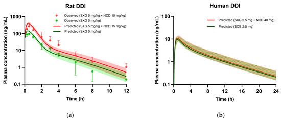 PBPK model simulations of saxagliptin plasma concentration-time profiles following oral administration without or with nicardipine. In rats (a), observed values are indicated by data points for groups treated with saxagliptin alone (green) and co-administered with nicardipine (red). Solid lines and shaded regions denote the mean and 95% prediction interval of predicted saxagliptin plasma concentration, respectively. In humans (b), solid lines represent the mean of predicted saxagliptin plasma concentration, while shaded (or dotted) regions represent the 95% prediction interval of predicted saxagliptin plasma concentration. SXG: saxagliptin, NCD: nicardipine.
