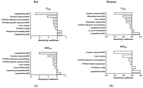 where ∆PK represents the change in predicted Cmax and AUCinf, with PK representing the initial value of Cmax and AUCinf. ∆p represents the alteration of the assessed model parameters, with p representing the initial value of these parameters. A SC value of +1.0 indicates that a +10% change in the model parameter causes a +10% change in the Cmax and AUCinf.