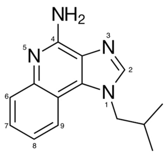 IMQ (240.304 g mol−1), whose structure is reported in Figure 1, is a synthetic drug belonging to the class of imidazoquinolones. It has received FDA approval for the treatment of external anogenital warts, actinic keratoses, and superficial basal cell carcinomas. The characteristics of IMQ led to extensive off-label therapeutic trials [1]. IMQ has an immunostimulant activity due to the agonism of Toll-like receptors 7 and 8, which module innate immune system inducing secretion of pro-inflammatory cytokines such as interferon-α, interferon-γ, tumor necrosis factor α, and interleukin 12 [2]. In addition, the topical administration of IMQ induces the functional maturation of epidermal Langerhans cells, stimulates migration to regional lymph nodes, and promotes a Th1-based and antigen-specific CD8+ T cell response [3].