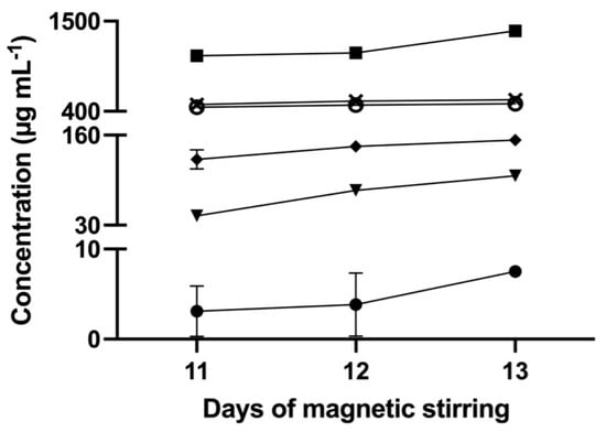 The solubility of IMQ was investigated by adding an excess amount of IMQ to H2O, EtOH, MeOH, DMSO, acetone, and ACN. The samples were kept at 30 °C under magnetic stirring until solid–liquid equilibrium was reached; the attainment of equilibrium was checked by measuring the drug concentration until it became constant. Based on preliminarily solubility tests, the first measurement was set to 11 days (with magnetic stirring); however, such time was insufficient to reach equilibrium. The data variability was extremely high, especially for H2O and acetone (Figure 2). In addition, after 12 days, the concentrations obtained were slightly higher than the previous day. One day later, the concentrations increased, and the difference between the replicates became negligible. This evidence was interpreted as a sign that equilibrium was reached in all of the studied solvents. This observation applied to four out of six of the studied solvents. Thus, considering 13 days of magnetic stirring as necessary to attain equilibrium, it was hypothesized that the discrepancies found in the literature (Table 1) could be partly ascribed to the fact that the IMQ/solvent contact time may not be sufficient to reach equilibrium. In addition, in the absence of stirring, the IMQ concentration in solutions was close or even below the LOD of the calibration curve, whereas, at the same time, with magnetic stirring, the values were significantly higher, which confirms the strong effect of stirring on the peculiar IMQ dissolution. The possible effect of light in IMQ solubilities was not considered, and solutions were always kept inside amber glass vials.