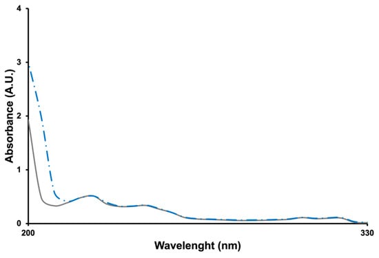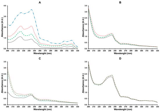 In the case of H2O (Figure 3A), two main absorption peaks were observed at 225 and 245 nm, followed by two secondary peaks at 305 and 320 nm. The absorbance increased significantly with the temperature, reaching very high values for the spectrum recorded at 85 °C, with the position of the peaks unchanged.
