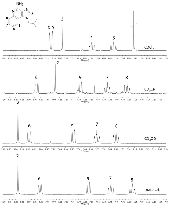 NMR studies were performed to further explain the solubility behavior of IMQ in different solvents. Unfortunately, because of the extremely low water solubility of IMQ, the NMR spectrum in D2O could not be registered. Figure 5 reports the spectrum region of aromatic protons (7.0–8.3 ppm) with the attribution of the signals. These signals are the most influenced by the aggregation phenomena and could add some information on the solvation of IMQ. In fact, the chemical shifts change significantly depending on the solvent, and the ones that shift most are the signals of the protons close to the nitrogen atoms (H2, H6, and H9). The pattern of the signals in DMSO is very similar to that in MeOH, indicating a similar kind of solvation. It looks like both solvents can break intermolecular H-bonding and solvate the amino group in the 4-position. DMSO is a significantly better hydrogen-bond acceptor than ACN [25] and, in fact, the signal of H2 in CD3CN is less deshielded, with a value closer to that in CDCl3. The spectrum in acetone (Supplementary Materials, Figure S3A) could not be compared with the others because it is clear the presence of a mixture of molecules likely due to the formation of an imine between the -NH2 of IMQ and the carbonyl of the solvent. This hypothesis is confirmed by the NMR spectrum taken by adding about 10% v/v D2O into the NMR tube containing the IMQ–acetone solution: a remarkable reduction in the complexity of the signals was observed (Supplementary Materials, Figure S3B), indicating that most of the species were in equilibrium with IMQ.