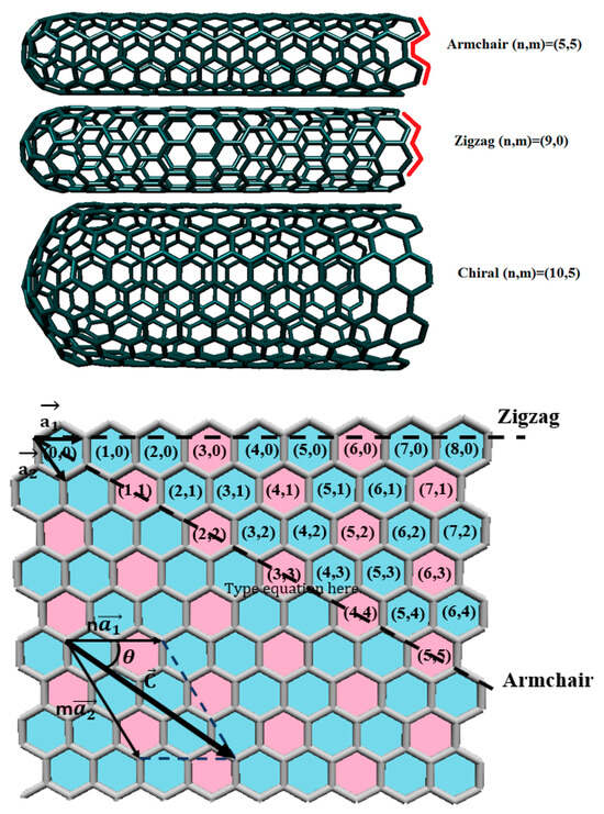 Schematic diagram showing zigzag, armchair, and chiral SWCNTs; the semi-conductive and metallic SWCNTs are labeled with blue and pink colors, respectively.