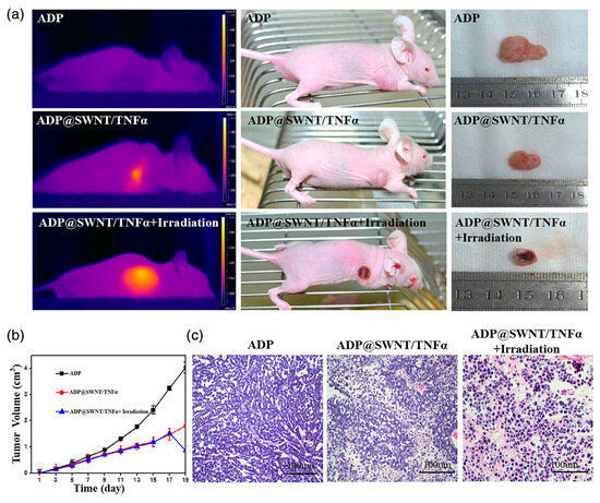 Tumor-inhibitory effects of ADP@SWNT/TNFα and ADP@SWNT/TNFα+laser irradiation on human colorectal cancer in nude mice. (a) Photographs, (b) tumor volumes (measured every 2 days), (c) pathological examination of the gastrointestinal cancer tissues of nude mice injected with ADP, ADP@SWNT/TNFα, and ADP@SWNT/TNFα+irradiation. Reproduced with permission from ref. [134]. Copyright 2022, John Wiley and Sons.