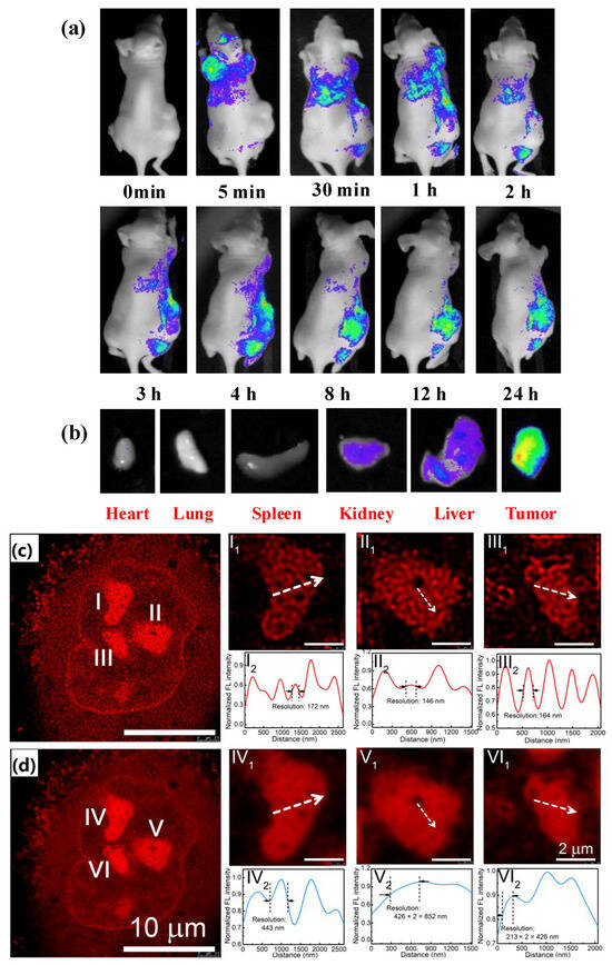 (a) In vivo fluorescence imaging of nude mice after intravenous injection of the carbon quantum dot-wheat straw solution; (b) representative fluorescence images of dissected organs of a mouse after intravenous injection of carbon quantum dot-wheat straw solution for 24 h. Reprinted with permission from Huang et al. [262]. (c) STED image and (d) confocal image of a representative A549 cell stained by (Ni-pPCDs). (I1, II1, and III1) Enlarged STED images of the nucleoli of the A549 cell in (c), and (I2, II 2, and III2) corresponding fluorescence intensity analysis results of the marked lines in I1, II 1, and III1. (IV1, V1, and VI1) Enlarged confocal images of the nucleoli of the A549 cell in (d) and (IV2, V2, and VI2) corresponding fluorescence intensity analysis results of the marked lines in IV1, V1, and VI1. (c,d) Reproduced with permission from ref. [263]. Copyright 2019, American Chemical Society.