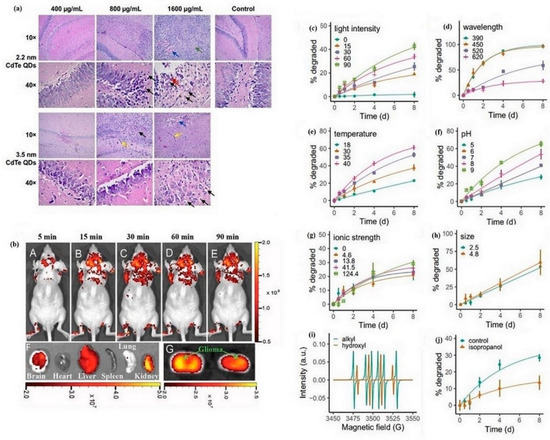Wu et al. [273] investigated the unwanted effects of intrahippocampal injections of 3-mercaptopropionic acid (MPA)-functionalized CdTe QDs, ultra-structure of neurons, hippocampus, and synapses in rats. Transcriptome sequencing was applied to discover the underlying mechanisms [273]. The results of histological analyses of the hippocampus of rats treated with 2.2 nm and 3.5 nm MPA-capped CdTe QDs showed an irregular arrangement of neurons and cellular swelling [273]. Wang et al. [274] synthesized polymer-coated nitrogen-doped carbon nanodots (pN-CNDs) with particle sizes between 5 to 15 nm through a solvo-thermal reaction. The original product showed high water solubility and adjustable fluorescence. Figure 5b (A–E) shows the fluorescent imaging at different times of post-injection of pN-CNDs [274]. Figure 5b (F,G) shows coronal imaging of the main organs 90 min after pN-CND administration. The results showed glioma possesses a high and considerable accumulation of pN-CNDs [274]. Liu et al. [275] reported that the produced CDs irradiated with light will convert to toxic molecules either for normal (HEK-293) or cancerous (HeLa and HepG2) human cells. Figure 5c–j shows the effect of different parameters such as light intensity, pH, wavelength, temperature, and ionic strength [275]. The results showed CD degradation increased as light intensity increased (Figure 5c) and the wavelength decreased (Figure 5d). Also, more CDs degraded at higher temperature or pH (Figure 5e,f) [275]. Ionic strength (Figure 5g) and size (Figure 5h) did not play an important role in CD degradation. Liu et al. reported [275] that when CDs were irradiated with white fluorescent for 10 min, alkyl and hydroxyl radicals were organized (Figure 5i). Figure 5j indicates the main role of isopropanol in decreasing degradation of CDs [275].