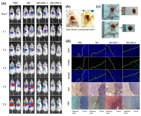 In vivo therapeutic efficacy of ND-UNC0646 evaluated using orthotopic HCC mouse model. (a) Representative images of Luc-SNU-398 liver tumor-bearing mice undergoing multiple treatments with PBS, ND, low-dosage of ND-UNC0646 (1 mg/kg), and highdosage of ND-UNC0646 (2 mg/kg) showing in vivo therapeutic efficacy of ND-UNC0646. NDUNC-1 represents a low dosage of ND-UNC0646 (1 mg/kg), while ND-UNC-2 represents a high dosage of ND-UNC0646 (2 mg/kg). ‘Pre-T’ denotes pre-treatment; T 1, T 2, T 3, T 4, and T 5 denote each dose. (b) Representative pictures depicting orthotopic liver transplantation surgery. (c) Representative pictures showing a mouse that successfully developed an orthotopic liver tumor. (d) In vivo biocompatibility assessment by histological analysis. Representative images show apoptotic response and histological morphology in normal liver tissue and HCC tumor tissue after drug treatment. Yellow lines denote the boundaries between adjacent normal liver tissue and tumor tissue. Figure 6 Reprinted with permission from ref. [331]. Copyright 2019, American Chemical Society.