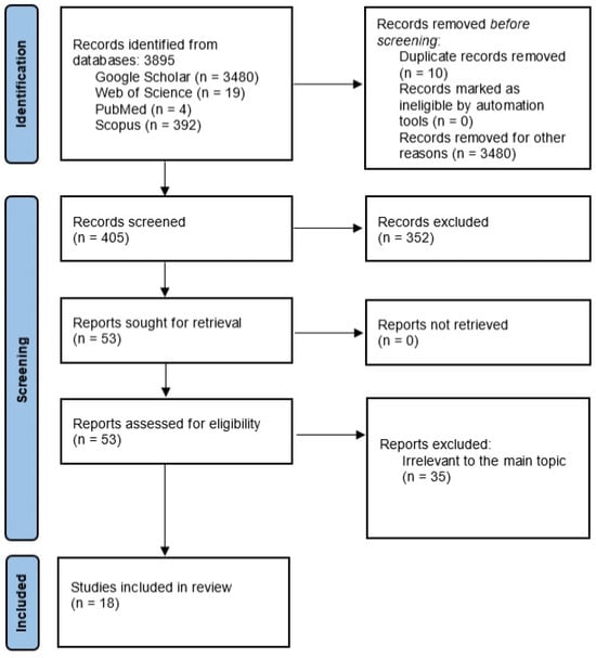 The initial search identified 3895 potentially relevant review articles from the four databases over the last ten years. After the exclusion of the records from Google Scholar, due to the inability to advance the search with all the inclusion criteria and the irrelevance of the suggested articles, 415 studies remained. Ten duplicate records were excluded. This left 405 studies for evaluation. Finally, 18 studies relevant to the topic were included in the present systematic review. Figure 1 illustrates a PRISMA flow chart of the selection process.