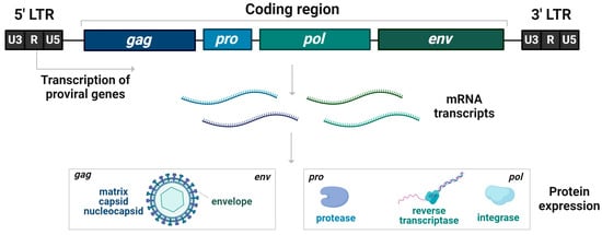 Retroviruses are encapsulated reverse-transcribing viruses with single-stranded RNA (ssRNA) genomes. These RNA viruses have the ability to produce a double-stranded DNA copy of their genome during their replication cycle in the host cell upon infection. Retroviruses, belpaoviruses, metaviruses, and pseudoviruses share capsid and nucleocapsid proteins [,]. According to the complexity of their genomes, retroviruses might be classified into two groups: alpha, beta, gamma, and epsilon viruses have simple genomes, while lentiviruses, deltaviruses, and spumaviruses have more complex genomes [].