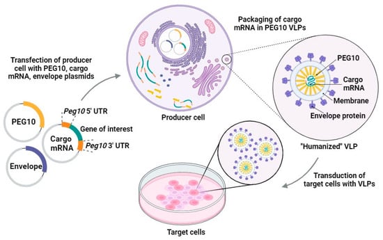 VLPs can be built from endogenous human proteins which are based on PEG10. This approach has an advantage of reducing immunostimulation and the toxicity of mRNA-containing VLPs transporting into the cytoplasm []. Certain human retroelements retain some of their functionality. They bind and transport mRNA within the cell [].