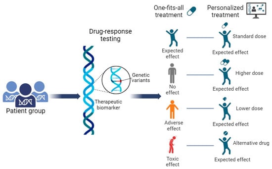 Interindividual variability in drug response is a huge problem when pharmacological treatment is prescribed. A person may have individual differences that may be acquired during his life or inherited from parents through genetic material. In 1983, already 40 years ago, Sweeney wrote that variations in drug response may be pharmacodynamic or pharmacokinetic []. The pharmacodynamic response indicates the different strength of the pharmacological effect on the receptor at the same drug dose. Pharmacokinetic means that a person can have a different concentration of the active substance molecule at the same drug dosage. Nowadays, it is obvious that the pharmacological profile of each individual person is encoded by the genes (Figure 3). Pharmacogenomics combines pharmacology and genomics to select safe and effective drugs, formulations, and dosages for individuals [].