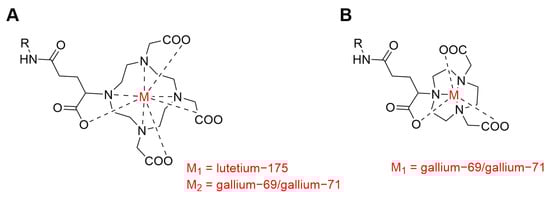 By using the same methods, the chemical stability of metal–chelator complexes may be assessed in a non-radioactive form, addressing another highly relevant question regarding the development of novel radiopharmaceuticals. As a proof of principle, we examined DOTAGA- and NODAGA-chelators, as they are well known in the field of nuclear oncology, and they were already used in clinics in combination with PSMA-targeting agents [,,]. The DOTAGA-chelator is known to form stable complexes with lutetium-175, but it is not ideal for complexation with gallium ions. On the other hand, the NODAGA chelator forms gallium complexes with high stability; however, it cannot be used to complex lutetium-175 (Figure 1) [].