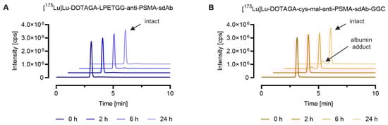 Comparison of the stability of 175Lu-labeled DOTAGA-anti-PSMA-sdAb conjugates synthesized via two different conjugation chemistries, sortase catalyzed ligation vs. maleimide conjugation. The graphs show representative chromatograms obtained by SEC-ICP-MS analysis. Evaluation of the results was performed using the QtegraTM software. (A) [175Lu]Lu-DOTAGA-LPETGG-anti-PSMA-sdAb; (B) [175Lu]Lu-DOTAGA-cys-mal-anti-PSMA-sdAb-GGC.