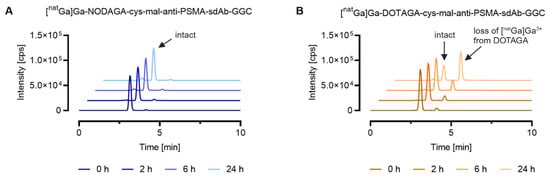 Comparison of the stability of natGa-labeled anti-PSMA-sdAb conjugates equipped with two different metal–chelator complexes conjugated via maleimide conjugation. The graphs show representative chromatograms analyzed by SEC-ICP-MS. Evaluation of the results was performed using the QtegraTM software. (A) [natGa]Ga-NODAGA-cys-mal-anti-PSMA-sdAb-GGC; (B) [natGa]Ga-DOTAGA-cys-mal-anti-PSMA-sdAb-GGC.