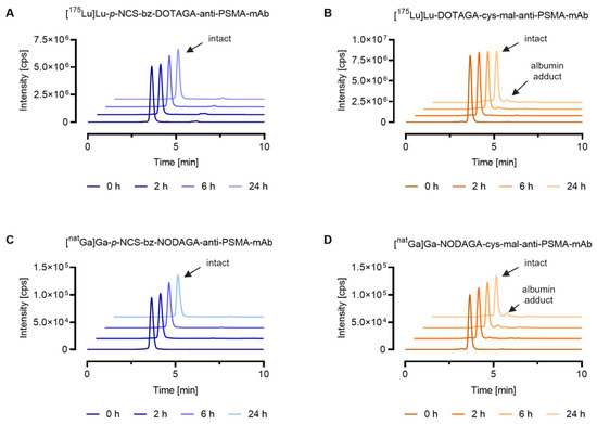 Stability of metal-labeled mAb conjugates in mouse serum at 37 °C up to 24 h. The graph shows representative chromatograms obtained by SEC-ICP-MS analysis. Evaluation of the results was conducted using the QtegraTM software. (A) [175Lu]Lu-p-NCS-bz-DOTAGA-anti-PSMA-mAb; (B) [175Lu]Lu-DOTAGA-cys-mal-anti-PSMA-mAb; (C) [natGa]Ga-p-NCS-bz-NODAGA-anti-PSMA-mAb; (D) [natGa]Ga-NODAGA-cys-mal-anti-PSMA-mAb.