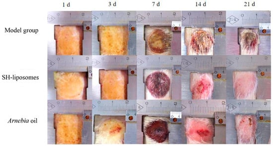 Out of the model group, Shikonin (SH)-based liposomal group, and Arnebia oil® group, applied topically twice daily for 21 days, SH-liposomes observed a better wound healing effect on the 21st day compared to the others (reprinted from [], copyright (2024), with permission from Elsevier).