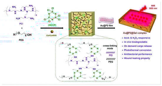 Schematic representation of hydrogen peroxide (H2O2)-responsive nanohydrogel with a photothermal conversion ability based on polyethylenimine (PEI), polyethylene glycol (PEG), hexachlorocyclic triphosphonitrile (HCCP), as well as gold nanoparticles. Reproduced from [] with permission from the Royal Society of Chemistry.
