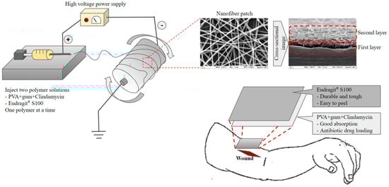 Kampanart and colleagues [] have successfully engineered a bilayer nanofiber wound dressing patch using the electrospinning technique (Figure 5). The initial layer included modified tamarind seed gum encapsulating PVA and clindamycin HCl, whereas the subsequent layer consisted of Eudragit® S100. The results obtained from the scanning electron microscopy (SEM) analysis revealed the presence of nanofibers, exhibiting a wide range of diameters, spanning from 153 to 1830 nm. These variations in diameter were observed to be impacted by sprayed solution formulation and equipment setting. The patch was effectively created by utilizing optimum electrospinning conditions. The drug analysis results have proven the presence of an amorphous state. The biological experiments conducted demonstrated effectiveness against Staphylococcus aureus. The utilization of Eudragit® S100 and modified tamarind seed gum exhibits promising prospects in augmenting the strength of nanofiber patches.