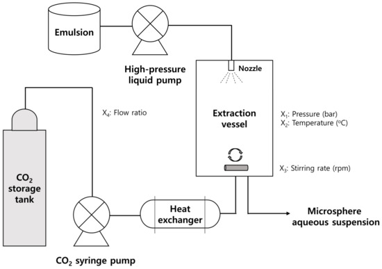 In the initial step, liquid CO2 was transferred from the storage tank to the preheater. The liquid CO2 was then heated and compressed before being transported to the cylindrical stainless-steel extraction vessel, which had a volume of approximately 70 mL. The conveyance of CO2 was accomplished via the a spray nozzle until the intended pressure level was reached utilizing an ISCO syringe pump (Model 260D, Lincoln, NE, USA). Upon achieving an equilibrium of pressure and temperature under the specified conditions, the prepared W/O/W double emulsion (15 mL) was introduced into the high-pressure extraction chamber via a liquid pump (Model 307, Gilson Inc., Middleton, WI, USA). Subsequently, SC-CO2 was continuously supplied to the vessel at a consistent flow rate to extract the used volatile organic solvent from the W/O/W emulsion utilizing a backpressure regulator (Tescom, model 26-1723-24-194, Minneapolis, MN, USA) under constant process conditions of pressure and temperature. During the extraction process, the emulsion was agitated utilizing a magnetic stirrer to enhance diffusion and prevent the coalescence of the emulsion. Throughout the SFEE process, the primary process parameters including pressure, temperature, stirring rate, and SC-CO2 flow rate were systematically adjusted within the ranges of 35–65 °C, 70–160 bar, 50–1000 rpm, and 1–40 mL/min, respectively. These selected factors are widely recognized as critical process parameters in SFE processes across diverse application fields [18,30,31,32,33,34,35,36,37]. After completing the extraction process, the chamber was gradually depressurized to reach atmospheric pressure. The prepared PLGA microspheres in the suspensions were collected, then washed and freeze-dried as described above.