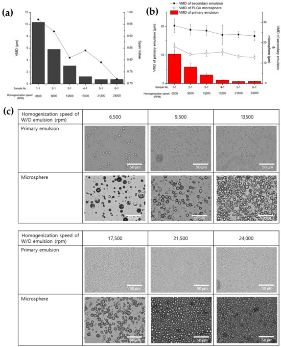 The influence of the primary (W/O) emulsion homogenization speed on (a) the particle size and SPAN value of the primary emulsion, (b) the particle size of the secondary emulsion and fabricated PLGA microspheres, and (c) optical microscopic images of the primary emulsions and PLGA microspheres.