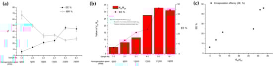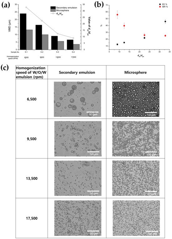 Interestingly, a significant impact of primary emulsion homogenization speed on both the EE and IBR was observed. (Figure 3a,b). The preparation at a higher homogenization speed during the primary emulsion preparation stage resulted in higher EE. It has been reported that microspheres exhibiting high EE are obtained from smaller primary emulsions [40,43]. In addition, as shown in Figure 3b,c, the ratio of the droplet diameter (dsd/dpd) of the secondary emulsion (dsd) to that of the primary emulsion (dpd) seemed to strongly affect the EE of BSA in the prepared PLGA microspheres [44]. Overall, it was shown that achieving a higher EE is more probable with an increase in dsd/dpd. From this result, it is suggested that the small value of dsd/dpd could mean that a thin oil layer existed around the primary emulsion, and that this thin oil layer facilitated the leakage of the inner phase into the outer water phase.