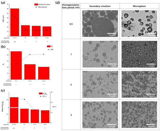 The effect of the homogenization time period during the preparation of the secondary emulsion was investigated under conditions where the time period varied between 0.5 and 4 min, with homogenization speeds set at 21,500 and 6500 rpm for the primary and secondary emulsions, respectively (Table 1 and Figure 5). The secondary emulsion prepared in a time period of 0.5 min of homogenization had a very large size (VMD = 60.88 µm) with an irregular size distribution (SPAN value = 1.86) (Figure 5a,d). This observation may be attributed to the inadequate mixing efficiency resulting from an insufficient homogenization time. On the other hand, the size of the secondary emulsions was not significantly affected by a homogenization time period between 1 and 4 min, although the span value was slightly decreased as a result of the increase in the homogenization time period (Table 1 and Figure 5a). In addition, it was confirmed again that the secondary emulsion size was well correlated proportionally with the solidified microsphere size. The homogenization time period during the secondary emulsification stage had a significant effect on both the EE and IBR of the BSA loaded onto the microspheres (Figure 5b,c). As the homogenization time period increased, the EE decreased. Additionally, the IBR of BSA increased with longer homogenization time periods. This negative result may be attributed to the increased diffusion of BSA out of the inner aqueous phase and the elevated surface exposure of BSA as the homogenization time period was prolonged. Furthermore, Figure 5c shows that, overall, microspheres with high EE were obtained when the value of dsd/dpd was large, consistent with the results presented above. However, interestingly, when comparing sample 5-1 with other samples for which the stirring time was increased, the value of dsd/dpd was similar, but the EE increased remarkably. This result suggests that increasing the stirring time could result in the leakage of the inner phase to outer water phase to easily occur through the DCM oil layer.