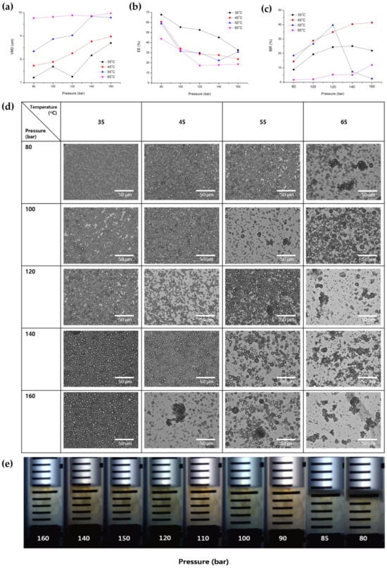 As depicted in Table 2 and Figure 6, it was observed that, overall, the particle size of PLGA microspheres increased with increasing pressure. This result can be explained by an earlier study, which suggested that the volume of the DCM droplet steadily increases until a dense thin layer of PLGA is fabricated during SFEE conducted at relatively high pressures [46].