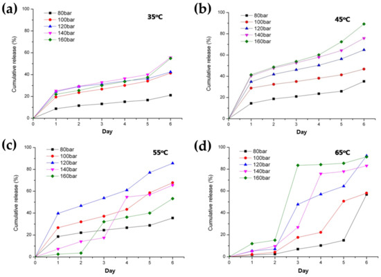 BSA release profiles from PLGA microspheres prepared via the SFEE process at various pressures and temperatures, (a) 35 °C, (b) 45 °C, (c) 55 °C, and (d) 65 °C.