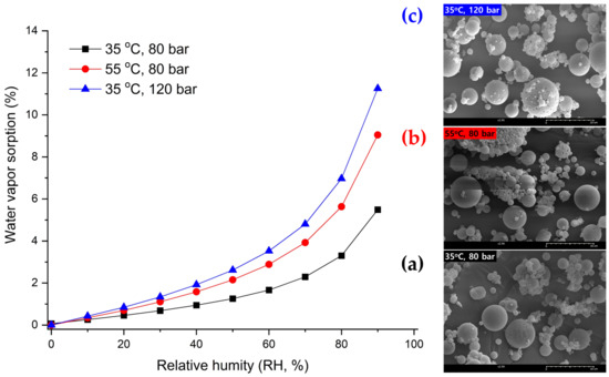 Water vapor sorption profile over increasing relative humidity (RH), and scanning electron microscopy (SEM) images of the PLGA microspheres prepared at (a) 35 °C and 80 bar, (b) 55 °C and 80 bar, and (c) 35 °C and 120 bar.