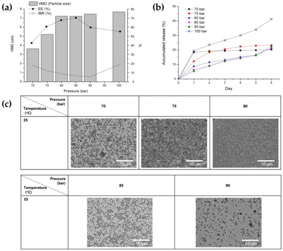 To investigate in more detail the impact of pressure variations on the notable alterations in the characteristics of PLGA microspheres, observed by the change in process pressure from 80 bar to 100 bar at 35 °C, additional experiments were conducted under pressure conditions ranging from 70 to 90 bar. Interestingly, a decrease in pressure below 80 bar actually resulted in a decrease in the particle size of the microspheres (Figure 9a,c). These results can be elucidated by referring to a previously documented theory indicating that at a low pressure, the volume of droplets initially increases until it reaches a maximum value, and subsequently decreases until a dense thin layer of the polymer is formed [46]. On the other hand, EE decreases and IBR increases as pressure decreases below 80 bar (Figure 9a). It is hypothesized that this outcome can be attributed to the delayed solidification of the outer layer of the microsphere, resulting from the lower DCM extraction efficiency at pressures below 80 bar at 35 °C. This phenomenon may lead to a decrease in EE through the outward diffusion of proteins across the oil layer during the solvent removal process, accompanied by an increase in IBR (Figure 9a,b).